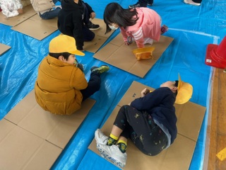 床に寝ると身体が痛かったようですが、ダンボールを敷くと少しだけ楽になることが分かりました。初めての経験のダンボールベッドは、床と離れる分、温かいことがわかりました。