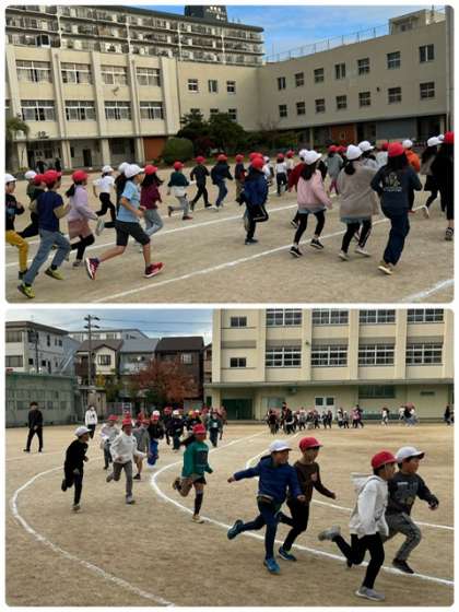 運動委員の6年生が全体への説明と準備運動を担当し、走ったり歩いたりしながら持久力を高めます。