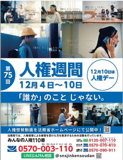 さて、昭和23年(1948)12月10日、国連総会において、全ての人民と全ての国とが達成すべき共通の基準として、「世界人権宣言」が採択されました。法務省の人権擁護機関では、昭和24年(1949)から毎年、人権デーを最終日とする1週間(12月4日〜10日)を「人権週間」と定め、その期間中、各関係機関及び団体と協力して、全国的に人権啓発活動を展開し、人権尊重思想の普及高揚を呼びかけています。