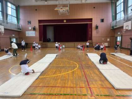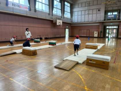 今日は前転をしたり、跳び箱を跳んだりしました。おへそを見る、両足で着地することに注意しながら、たくさん身体を動かすことができました。