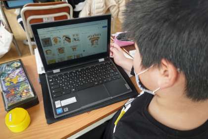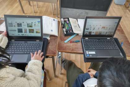 「○○が面白いから、写真がキレイだから、涙が出るほどこわいから」など理由も伝えながら紹介し、友達に紹介された本を一人一台端末で調べていきます。