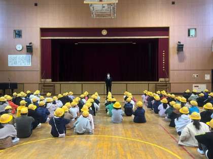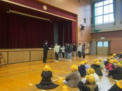雨天のため講堂にての実施です。いつもより元気なあいさつでスタートしました。