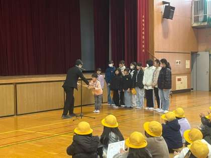 英検ジュニア、キックベースボールで頑張った児童に表彰状を伝達しました。