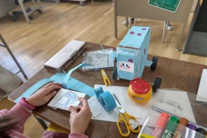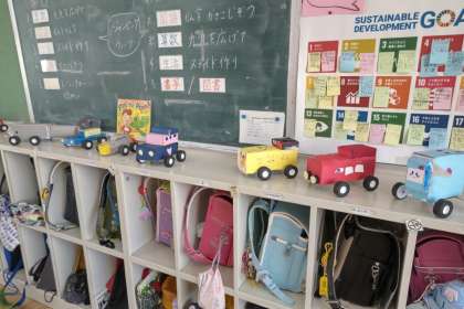 2年生が「おもちゃランド」でやった学習を思い出して車を作りました。