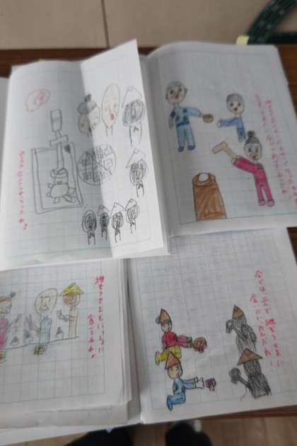 今までの読み取りで、「じいさま」と「ばあさま」の人柄を読み取っていた子ども達からは「食べきれないものを他の人にあげる」「食材を使って作ったご飯を困ってる人に渡しに行く」「地蔵様にお礼がてら、ばあさまも一緒にお供えを持っていく」など素敵な結末を考えることができました。