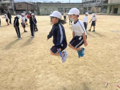 縄跳びでは2人跳びに挑戦し、2年生はペアで後ろ跳びも跳べるようになりました。