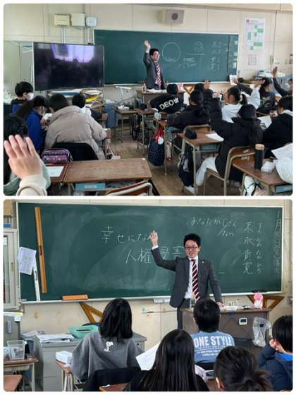 中:いじめは人権侵害となり、いじめに関する法律があることやロールプレイングを用いて楽しく学習。