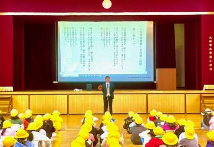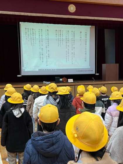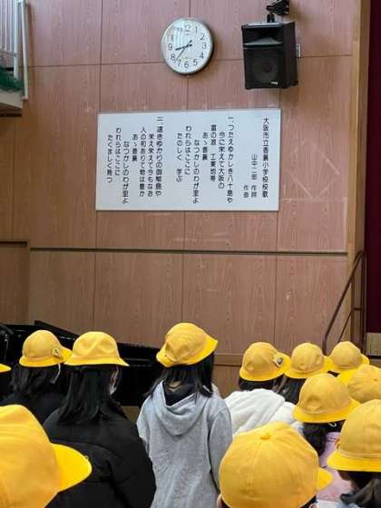 今日は雨だから講堂ではありません。本校の創立記念日が本日2月5日で、150歳の誕生日をみんなでお祝いするためです。当初の予定していた2月3日が式典だったら今日が代休でしたので、これも意味があったのかと思います。さぁお祝いの気持ちを校歌と記念式歌に心を込め、みんなで歌いましょう!