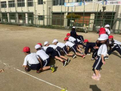 やる気満々でクラウチングスタートの真似をしています。1、2年生共に、持久力がついてきて10周以上走れる子が増えてきました。