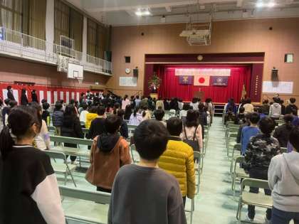 式典が始まりました。国歌、校歌、市歌を歌っています。