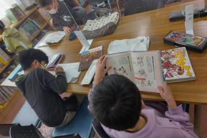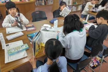 「読書頑張りカード8枚いった!!」など図書の時間も友達と競いながら楽しく本を読んでいます。