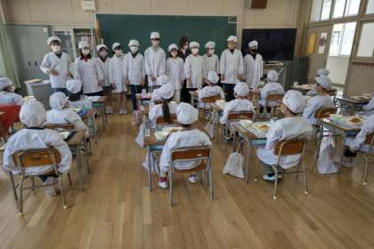 6年生が1年生の給食を運んで配膳してくれています、ありがとう。