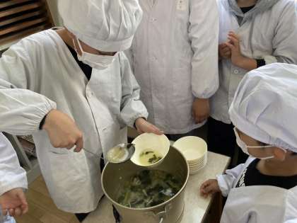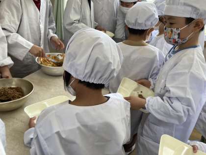 今までは、6年生が盛り付け、席まで持ってきてくれていましたが、自分のお皿を運びました。