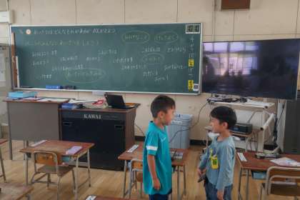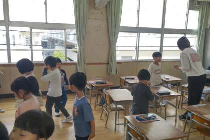 全校朝会で、4月の生活目標を伝えられた1年生。あいさつについて考えて、実践してみました。