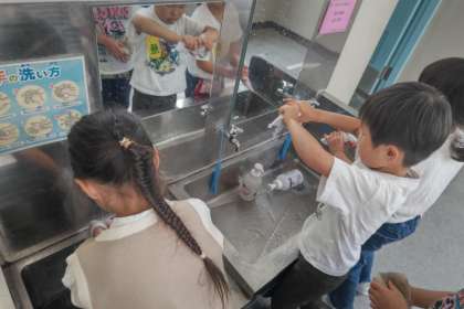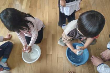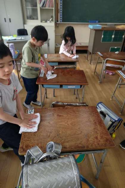 一人ひとり順番に雑巾の絞り方を確認して机を拭きます。
