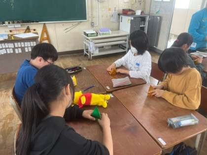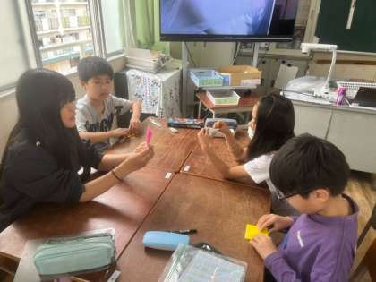 遠足で観光客にインタビューをするので、お礼のツルをおりました。それぞれの班に鶴マスターがいたので、「できてるの?」と確認しながら進めました。