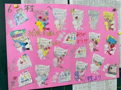 給食開始から2週間、一緒に給食の準備をしてくれたお礼に、かわいい塗り絵を1年生が持ってきてくれました!