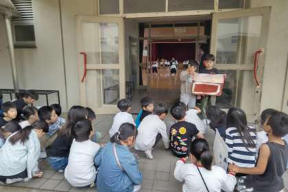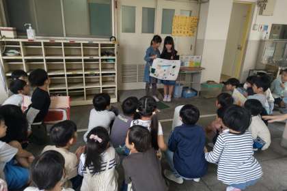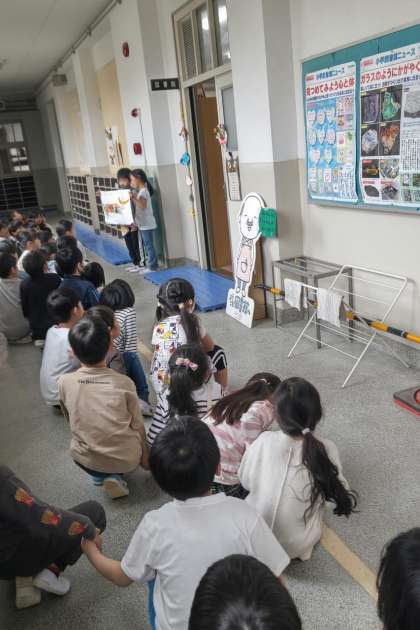事前にペアと仲良くなっていたので嬉しそうに手を繋いで、学校の説明を聞きました。