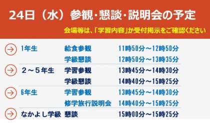 公私何かとご多用のことと存じますが、少しの時間でもご来校いただき、お子様や学級の様子をご覧いただきますようお願いいたします。