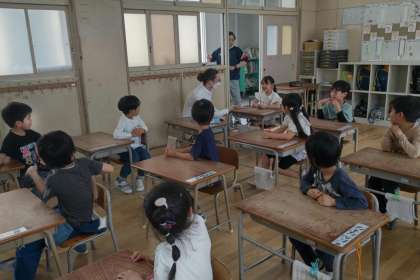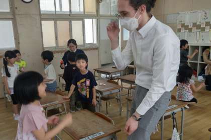つぎに、「ロックシザーズペーパー、123!」とじゃんけんをしていき色んな友だちと英語で自己紹介をしました。