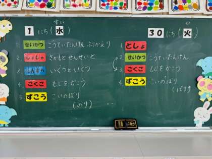明日からは、5時間目がスタートします。可愛く作ってくれた大小の時間割を見て活動できるようになりましょう。