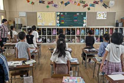 教科書にある「あいうえおのうた」を真似して、それぞれのペアで言葉を出し合って香簔小学校1年1組の「あいうえおのうた」が完成したので、みんなで音読しました。