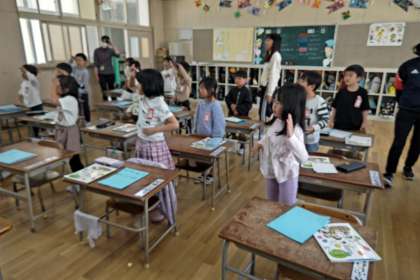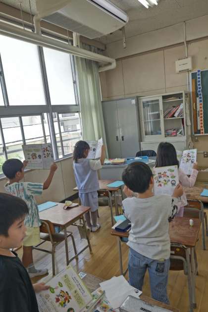 大型テレビや教科書を見ながら、「めだかの学校」「ひらいたひらいた」も歌っています。