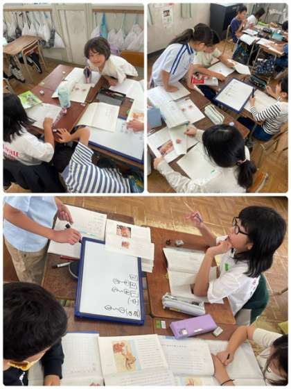 文章の組み立てがどうなっているのかを班で話し合っています。【始め】【中】【終わり】の3つのまとまりに分かるには、どこからどこまでの段落でまとまっているのかを考えました!