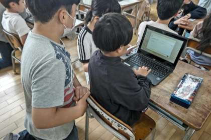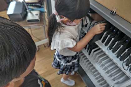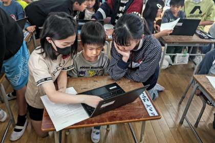 6年生に教えてもらいながら、タブレット型のパソコンを使いました。