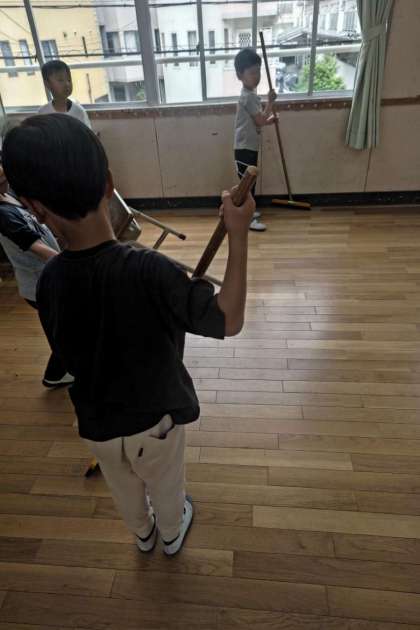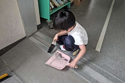 ホウキにちりとり、雑巾など道具をうまく使って丁寧に掃除をします。