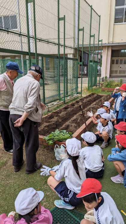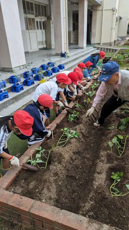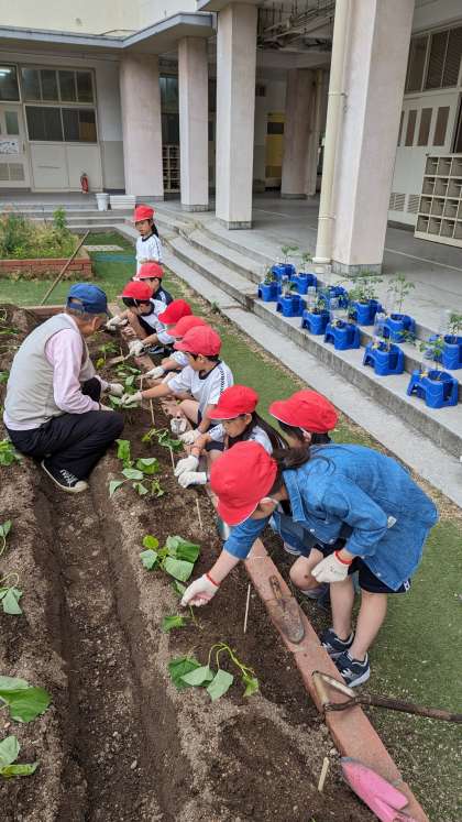 掘った穴に沿うようにして苗をおき、そっと土をかぶせました。