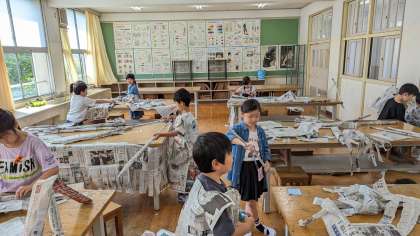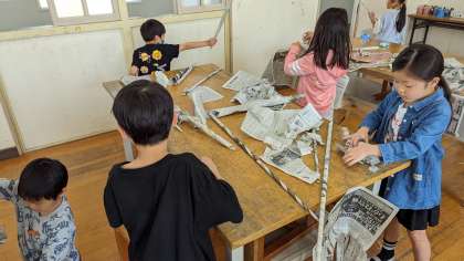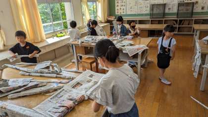 図画工作科では『しんぶんしと なかよし』という単元を通し、新聞紙で遊びました。(新聞紙をご用意いただき、ありがとうございました!)