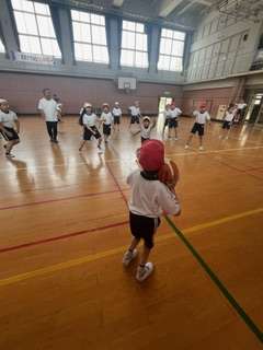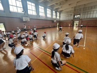 4年生と合同でドリブルリレー、ポートボールの試合を行いました。