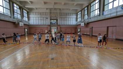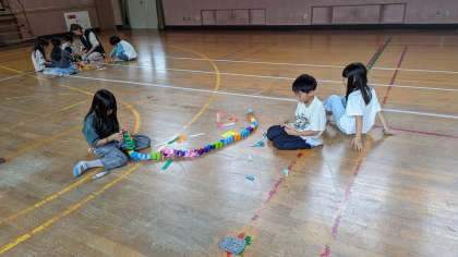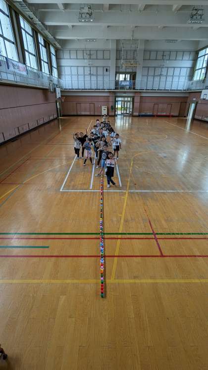 図画工作科で取り組んでいる輪繋ぎ、学校の一番大きい教室の橋から端まで届くものができるかな?と、いうことで、講堂にやってきました。