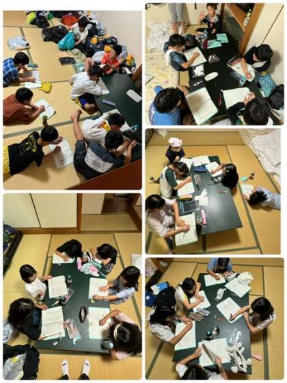 本日の振り返り、生活チェック表に記入しつつ、就寝準備も進めています。