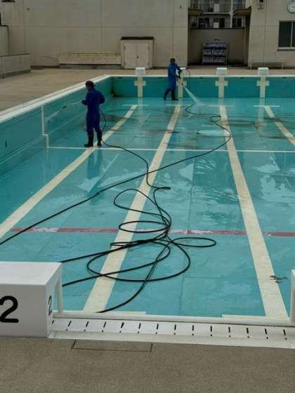 今日は、プール開きに向けたプール清掃を業者さんにお願いし、頑張っていただきました。
