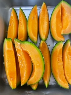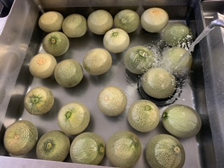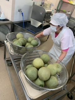 3回目は水槽ではなく、綺麗な流水で洗います。調理員さんがたくさんの量を切って、種もていねいにとってくださり、大変な作業です!美味しくいただきましょう!