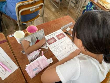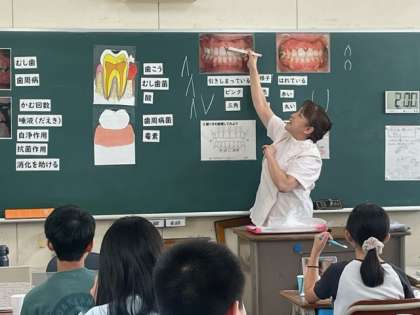 軽快なトークで楽しく授業をしてくだり、子どもたちは自分の歯茎の状態をチェックし、はみがきの仕方などについてしっかり学習していました。