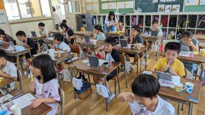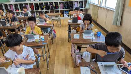 歯垢がたまると虫歯になること、歯垢は白くて見えないことを学習した後、歯垢を着色して、歯の汚れをみてみました。