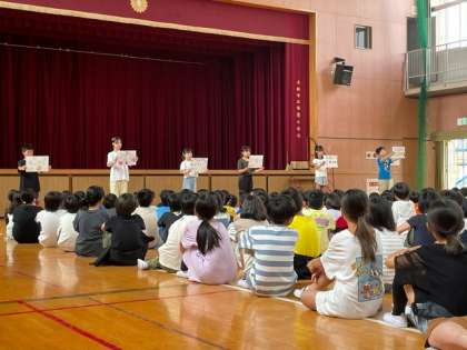 今日は各班がどんなお店をするか、集会で店長さんが発表しました!