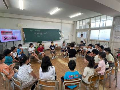 what day do you like ? というフレーズの学習をしました!イス取りゲームを「what day do you like ? 」というフレーズを使って行いました。周りに座っている人が全員で「what day do you like ? 」といい、真ん中人が曜日を英語で答えるというゲームでした。