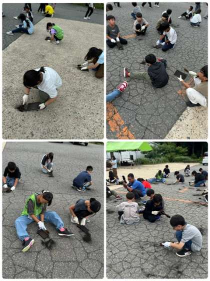 焼き板ペイントの説明を聴いて、焼き板磨きから始まりました。