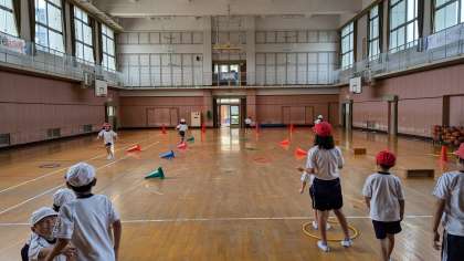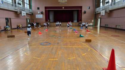 今日は跳んだり、くねくね走ったりしてチーム対抗で競争しました。走る順番を変えたり、応援し合ったり、チームで仲良く活動することができました。とても楽しんでくれました。