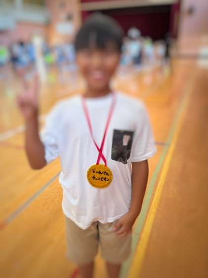 今日はじゃんけん対決をしました。スマイル班の人たちとペアでじゃんけんをした後、勝ち残った人同士で勝負をし、学校のチャンピョンを決めました。チャンピョンになった人は、メダルがもらえました。