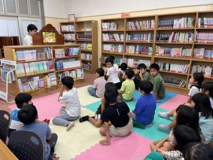 二月期の読み聞かせ初日です。熱中症予防の為、運動場が使用できなかったのでたくさんの子どもたちが来てくれました。お話は、バナナの国のバナナひめです。登場人物に分かれて声を変えながら読んでくれました。