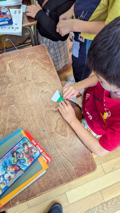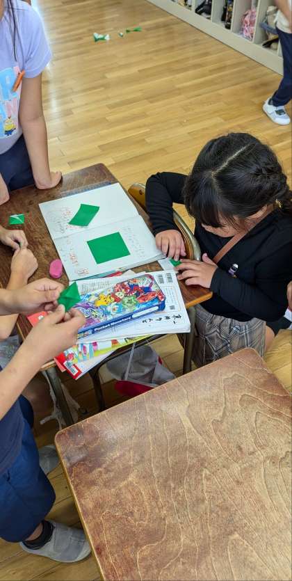 正方形が折り紙と同じ形と知り、いろんな大きさの正方形を作って折り紙あそびをしました。