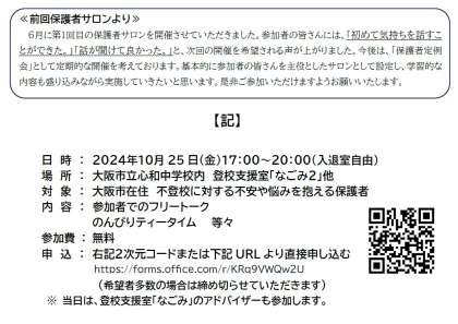 登校支援室「なごみ」では、お子様の不登校についてさまざまな不安や懸念される気持ちを持たれている保護者さまを対象に、今後「「保護者サロン」を定期的に開催したいと考えております。
