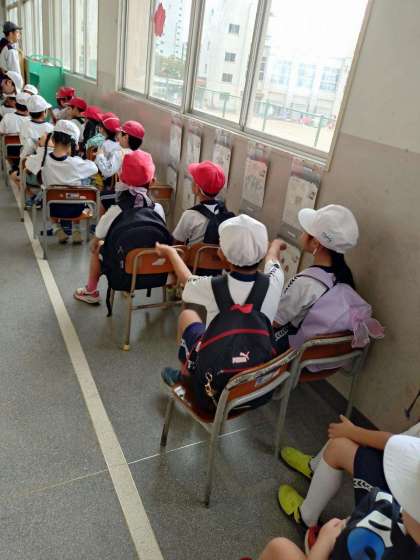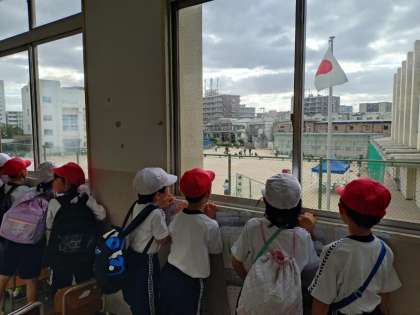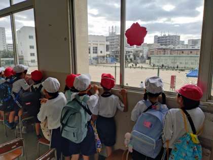 窓から応援に来てくださっている保護者の皆さまの様子を覗いています。