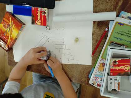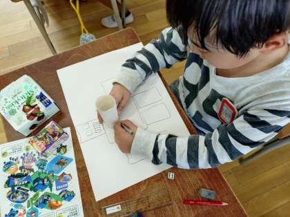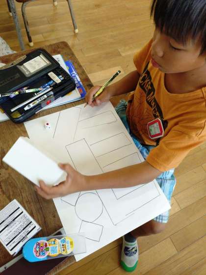 「かたちあそび」の学習では、おうちでご用意していただいた箱、つつ等を使いながら学習しています。
