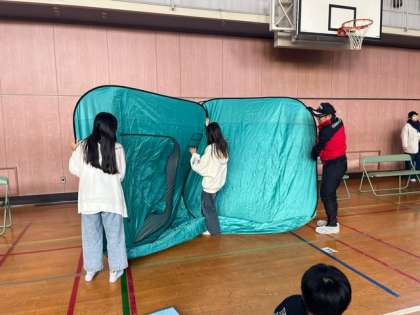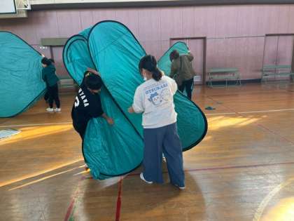 指示をしっかりと聞き、自分たちで簡易トイレ等を組み立て、避難所を設営しました。